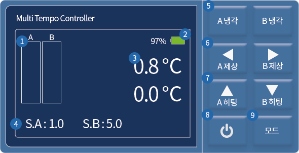 | 7 | 히팅동작 ON / OFF 버튼 | 8 | 콘트롤러 전원 ON / OFF 버튼 | 9 | 냉동기 동작 설정 버튼 |